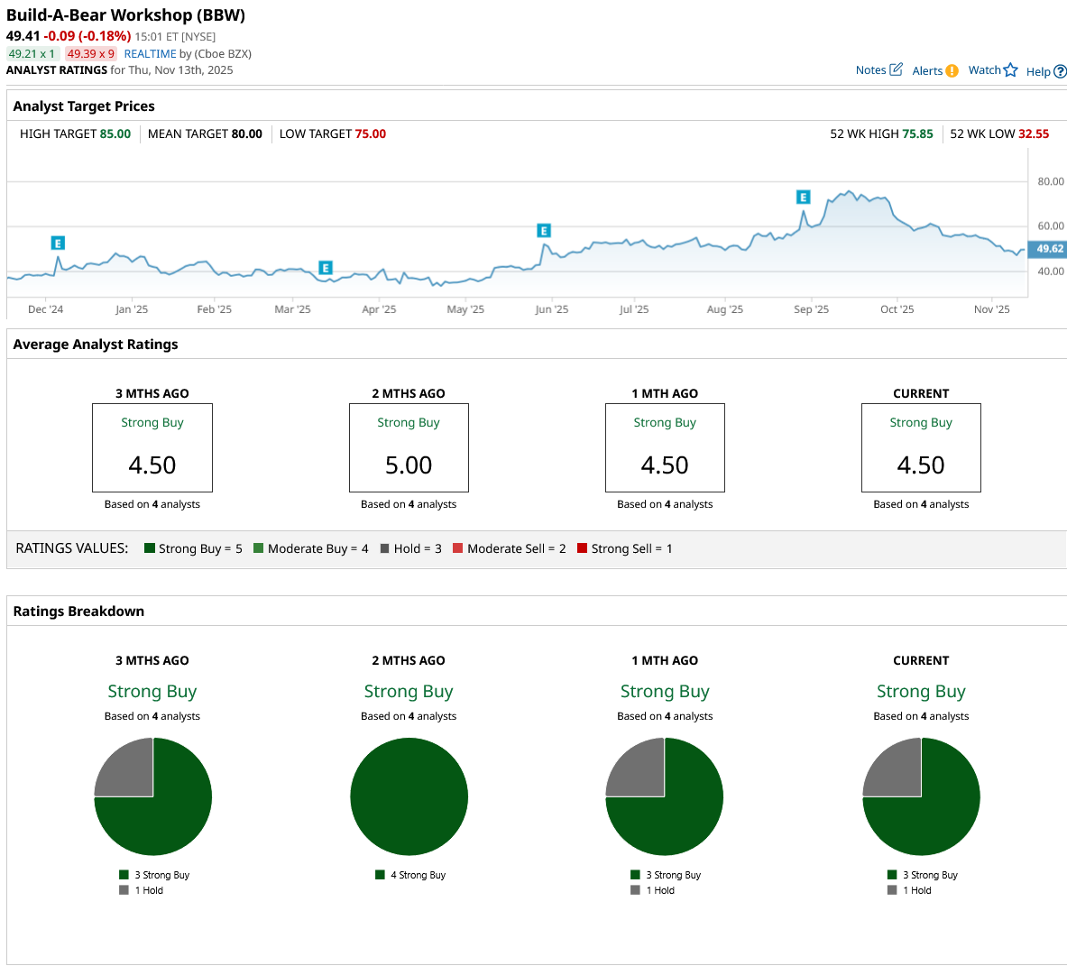 Out of the four analysts covering BBW stock, three recommend “Strong Buy,” and one recommends “Hold.” The average BBW stock price target is $80, indicating an upside potential of 60% from current levels.