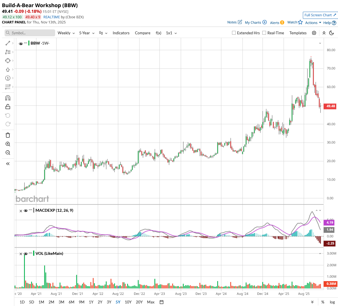 Wall Street's most unlikely success story isn't found in Silicon Valley boardrooms but in shopping mall storefronts where kids stuff plush animals. While Nvidia (NVDA) has dominated headlines in recent years, Build-A-Bear Workshop (BBW) has delivered returns of over 1,160% over the past five years, compared to the 1,380% returns of NVDA stock.
