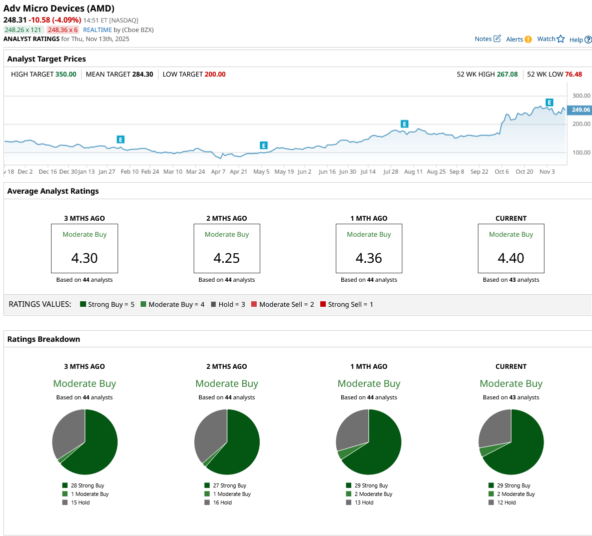 Out of the 43 analysts covering AMD stock, 29 recommend “Strong Buy,” two recommend “Moderate Buy,” and 12 recommend “Hold.” The average AMD stock price target is $284.30, above the current price of $248.