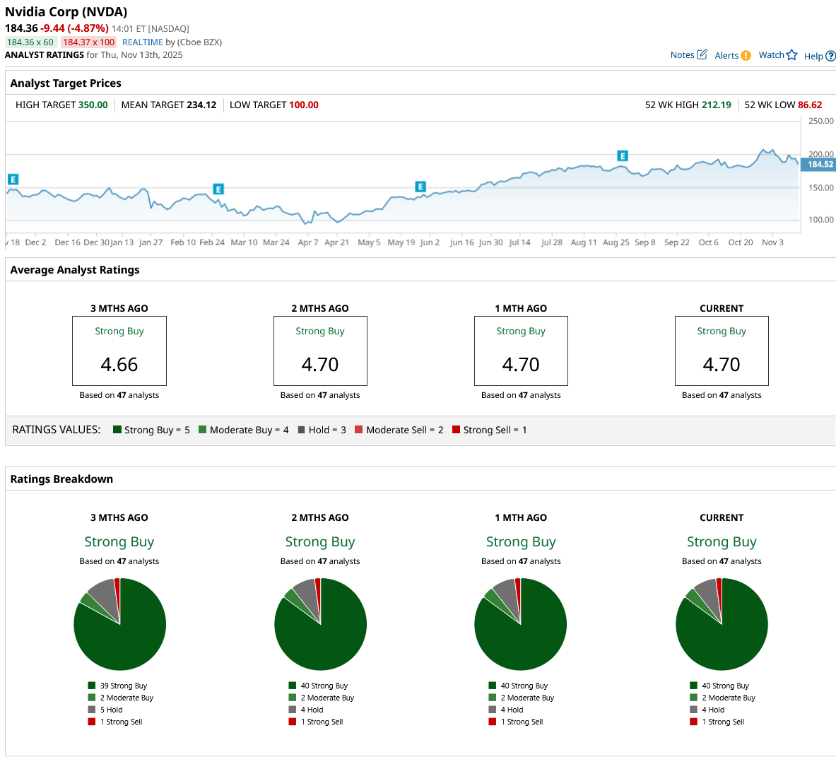 Wall Street analysts remain highly bullish on Nvidia’s growth prospects, as reflected in NVDA stock’s top-tier consensus “Strong Buy” rating. Of the 47 analysts covering the stock, 40 rate it a “Strong Buy,” two call it a “Moderate Buy,” four suggest holding, and one gives a “Strong Sell” rating. The average price target for NVDA stock stands at $234.12, indicating a 27% upside from current levels.