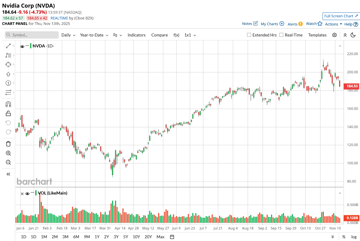 Shares of the AI darling have rallied 37.5% on a year-to-date (YTD) basis. NVDA stock came under pressure last week as Big Tech names retreated amid valuation concerns. Still, the stock kicked off this week on an upbeat note, rising more than 5% on Monday amid optimism about a possible end to the U.S. government shutdown and positive sentiment following CEO Jensen Huang’s meeting with executives at Taiwan Semiconductor Manufacturing. On Tuesday, the stock faced renewed selling pressure after Japan’s SoftBank Group (SFTBY) disclosed it had sold its entire $5.83 billion stake in the chipmaker.