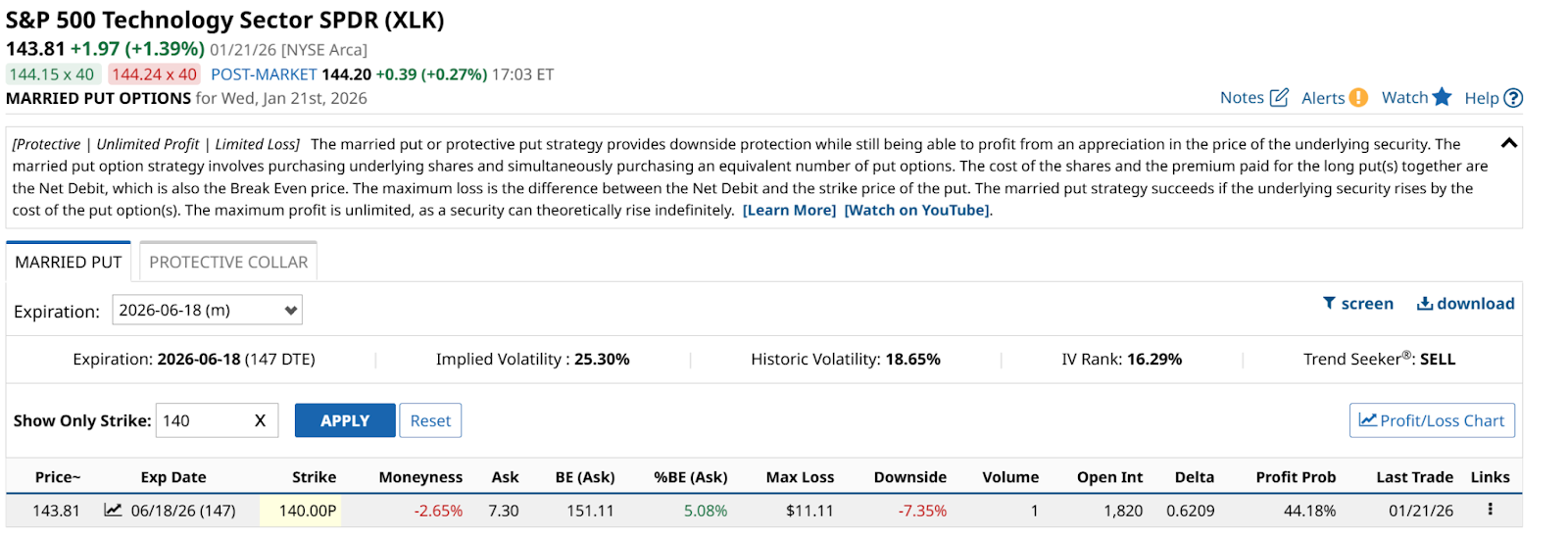 The puts are struck just below the current price, at $140 for this five-month time frame. I need the ETF to rise by 5% to break even, which is not bad considering how XLK is capable of performing if the market again shrugs off its present concerns.