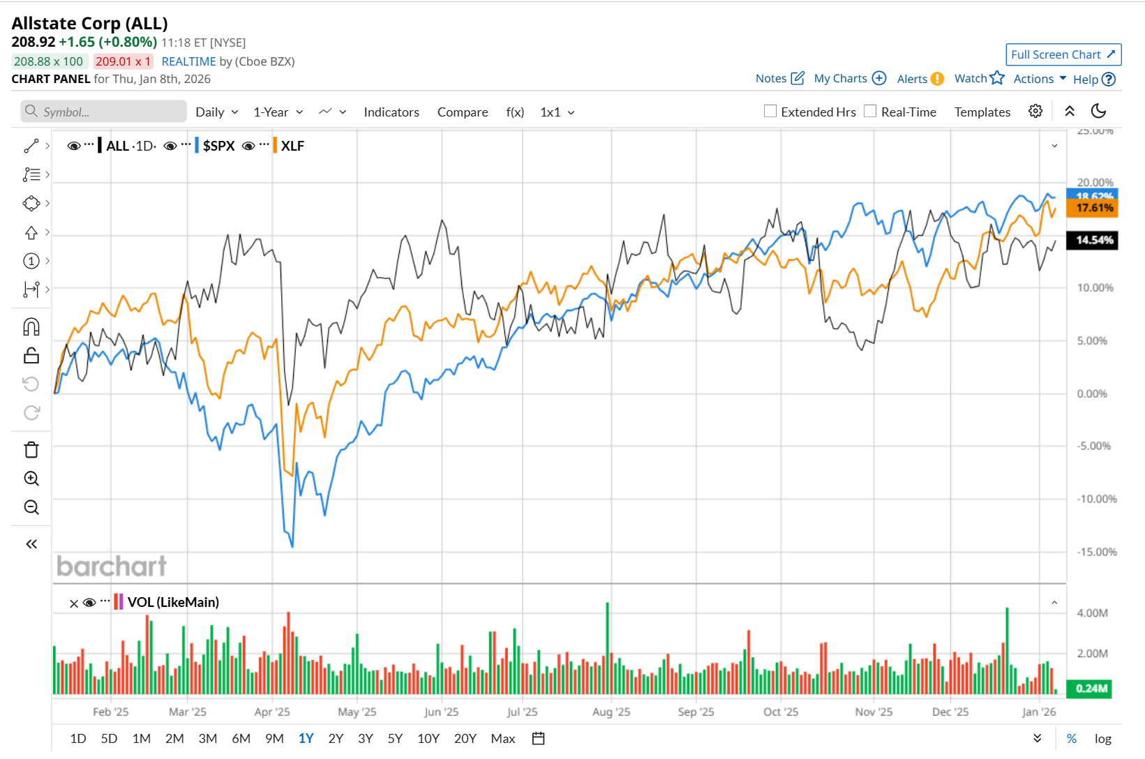 ALL has gained 9.2% over the past 52 weeks, underperforming both the S&P 500 Index's ($SPX17.1% return and the State Street Financial Select Sector SPDR ETF’s (XLF15.6% uptick over the same time period.