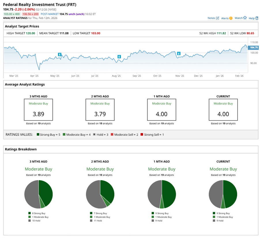 On Feb. 2, Juan C. Sanabria from BMO Capital maintained a “Buy” rating on FRT with a price target of $120, the Street-high price target, implying a potential upside of 14.6% from current levels.