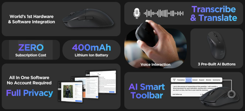 To be specific, this groundbreaking new device features an AI Smart Toolbar that offers an on-screen presence that coordinates the user experience for seamless one-click translation, rewriting, expanding, shortening, and summarizing text. People can leverage the Jethro V1 AI Mouse for PowerPoint generation, image creation, and voice typing and translation in more than 100 languages. The built-in OCR and document reader allows the Jethro V1 AI Mouse to summarize any document in mere seconds, and voice-to-text makes writing papers and e-mails easier than ever.