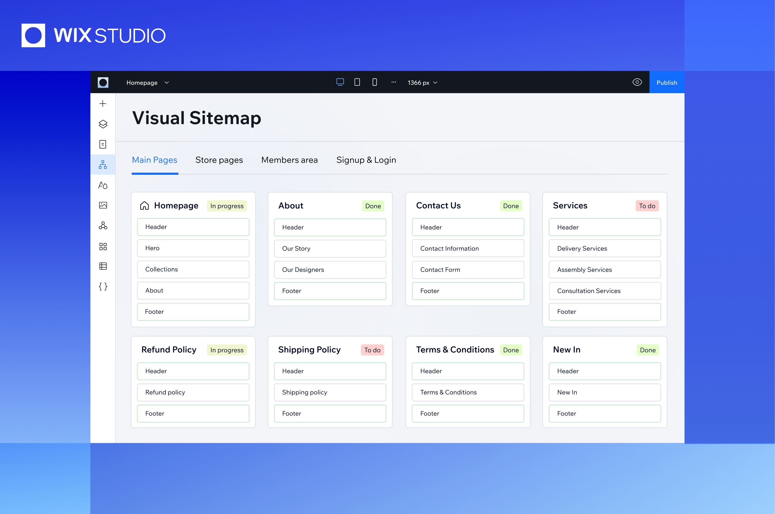 - Sync in Real-Time: Changes made to the visual sitemap will be instantly reflected on the site, and vice versa. This seamless integration ensures that users can quickly adapt their layouts and move forward with the design process.