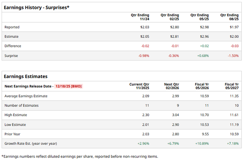 The Orlando, Florida-based company is expected to announce its fiscal Q2 2026 results before the market opens on Thursday, Dec. 18. Ahead of this event, analysts predict Darden Restaurants to report an adjusted EPS of $2.09, up nearly 3% from $2.03 in the year-ago quarter. It has exceeded Wall Street's earnings estimates in one of the last four quarters while missing on three other occasions.