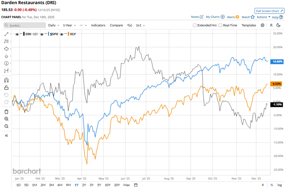 Shares of Darden Restaurants have risen 10.7% over the past 52 weeks, lagging behind both the S&P 500 Index's ($SPX) nearly 12% gain. However, the stock has outpaced the Consumer Discretionary Select Sector SPDR Fund's (XLY2.2% return over the period.