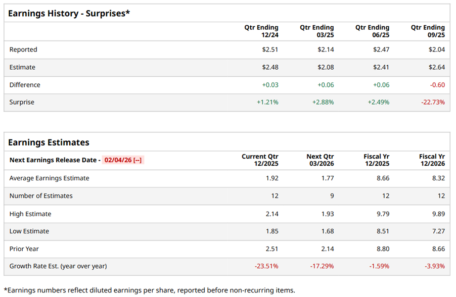 Milwaukee, Wisconsin-based Fiserv, Inc. (FISV) provides payments and financial technology services. Valued at $35.7 billion by market cap, the company provides solutions for customer deposit and loan accounts, digital banking, financial and risk management. FISV also manages card processing, cardless ATM services, and non-card digital payment solutions for financial institutions and corporate clients. The fintech giant is expected to announce its fiscal fourth-quarter earnings for 2025 in the near term.