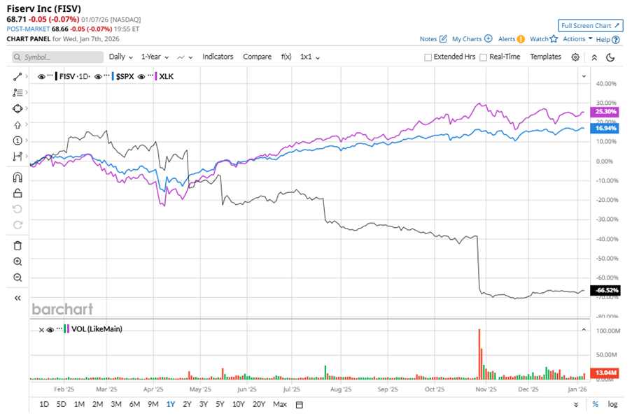 FISV stock has notably underperformed the S&P 500 Index’s ($SPX) 17.1% gains over the past 52 weeks, with shares down 66.3% during this period. Similarly, it considerably underperformed the Technology Select Sector SPDR Fund’s (XLK) 25.3% gains over the same time frame.