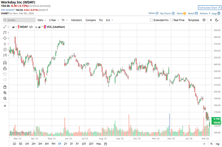 Concerns about the AI threat and broad-based weakness in the tech sector, especially in the cloud and SaaS segments, have led to a significant decline in WDAY stock over the past year. WDAY stock is down 45% over the past 52 weeks, while shares are down 32% year-to-date (YTD). Most recently, the stock reached a 52-week low of $142.72 on Feb. 11.