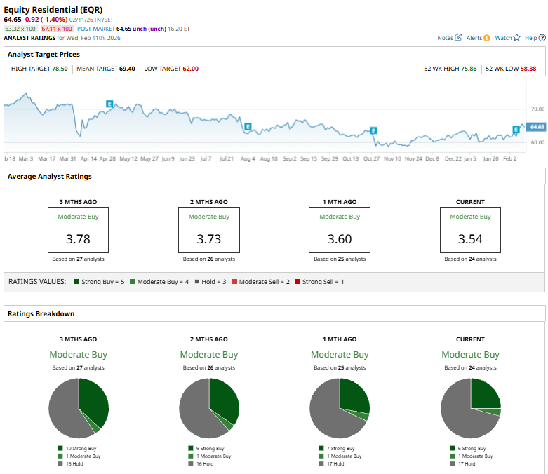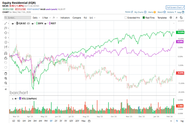 The real estate major has significantly underperformed the broader market over the past year. EQR stock prices have plunged 9.5% over the past 52 weeks, compared to the S&P 500 Index’s ($SPX) 14.4% gains. However, in 2026, the stock is up 2.6%, surpassing SPX’s 1.4% rise.