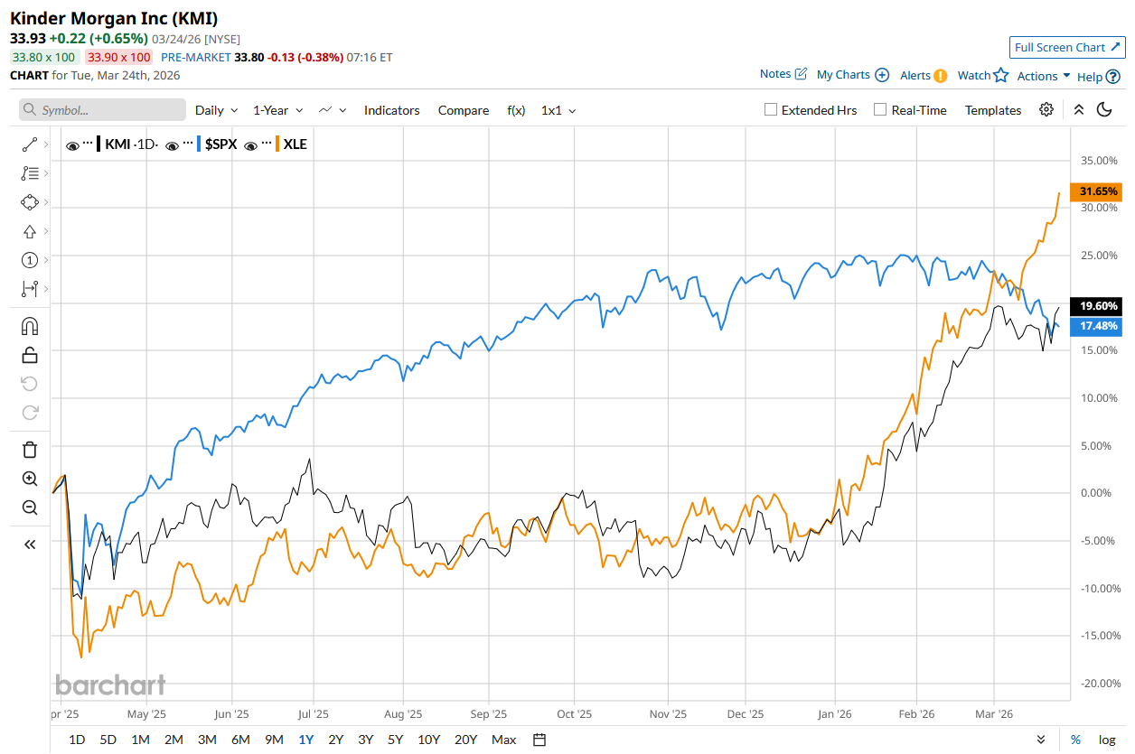 KMI stock has surged 18.2% over the past 52 weeks, outperforming the S&P 500 Index’s ($SPX) 13.7% rise, but lagging behind the State Street Energy Select Sector SPDR ETF’s (XLE) 31.1% return during the same time frame.