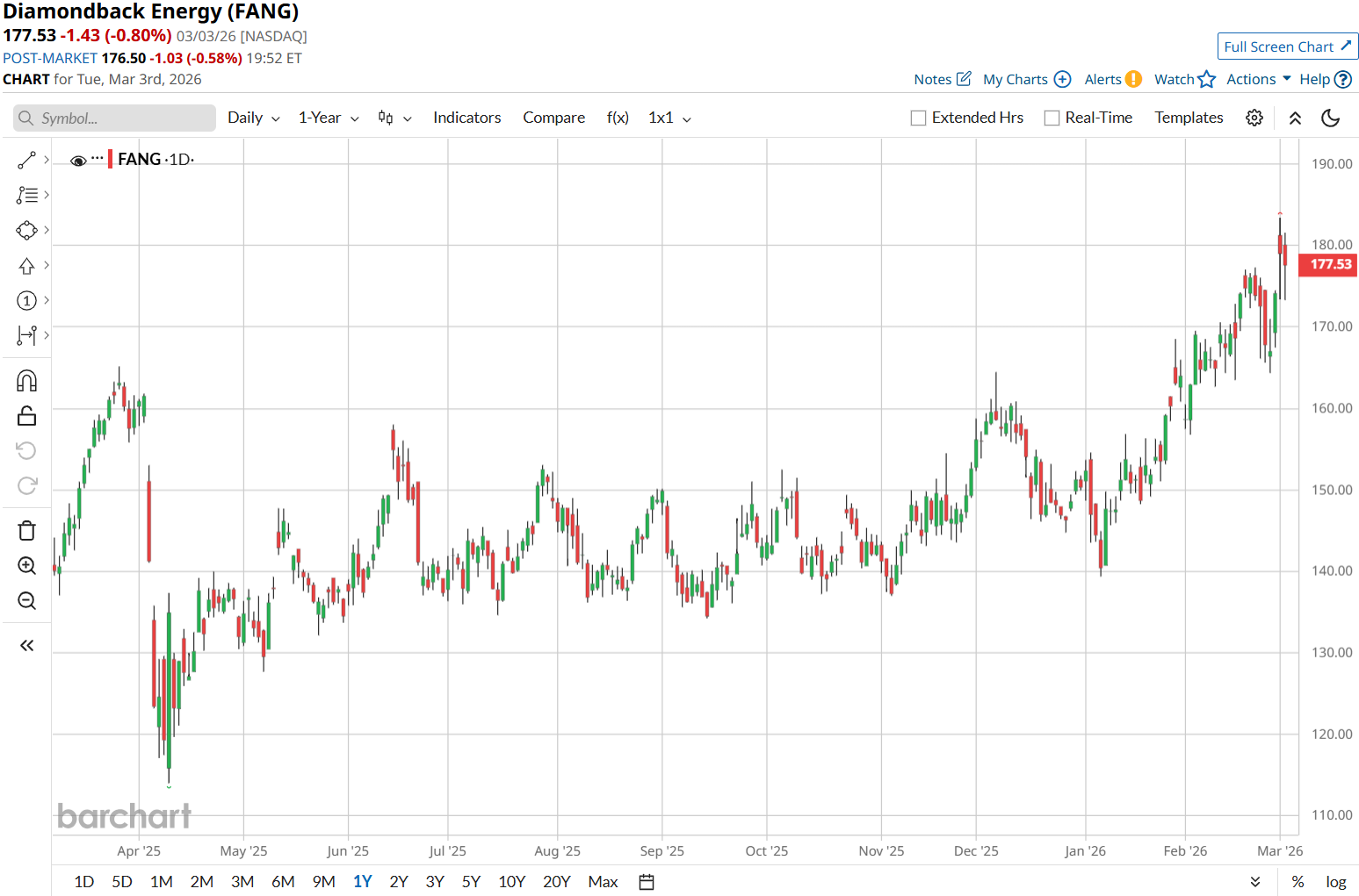 Diamondback Energy is a pure-play Permian Basin operator focused on horizontal drilling and development in the Midland and Delaware basins. Over the past 52 weeks, FANG shares have climbed nearly 30%, while year-to-date (YTD) the stock is up roughly 21%, reflecting growing confidence in Diamondback's assets and cash flow.