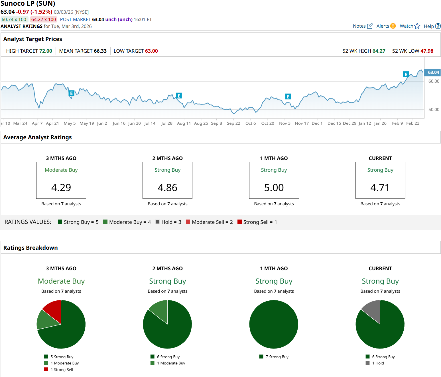 Analysts are very optimistic about SUN’s outlook, with seven analysts surveyed assigning a consensus “Strong Buy” rating and an average price target of $66.33. That target implies about 3% potential upside from recent levels.