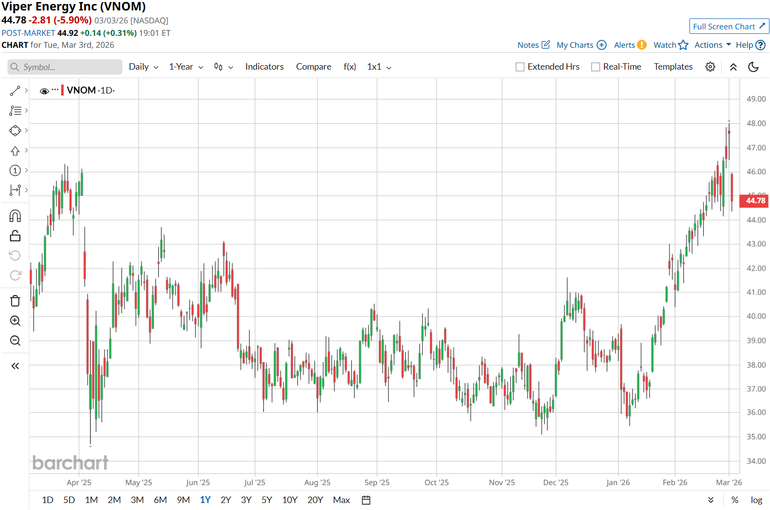 Viper Energy is a Permian-focused mineral and royalty company majority-owned by Diamondback Energy, collecting royalty income from oil and gas production instead of spending capital to drill its own wells. Over the past 52 weeks VNOM stock is up nearly 7%, while shares up 14% YTD.