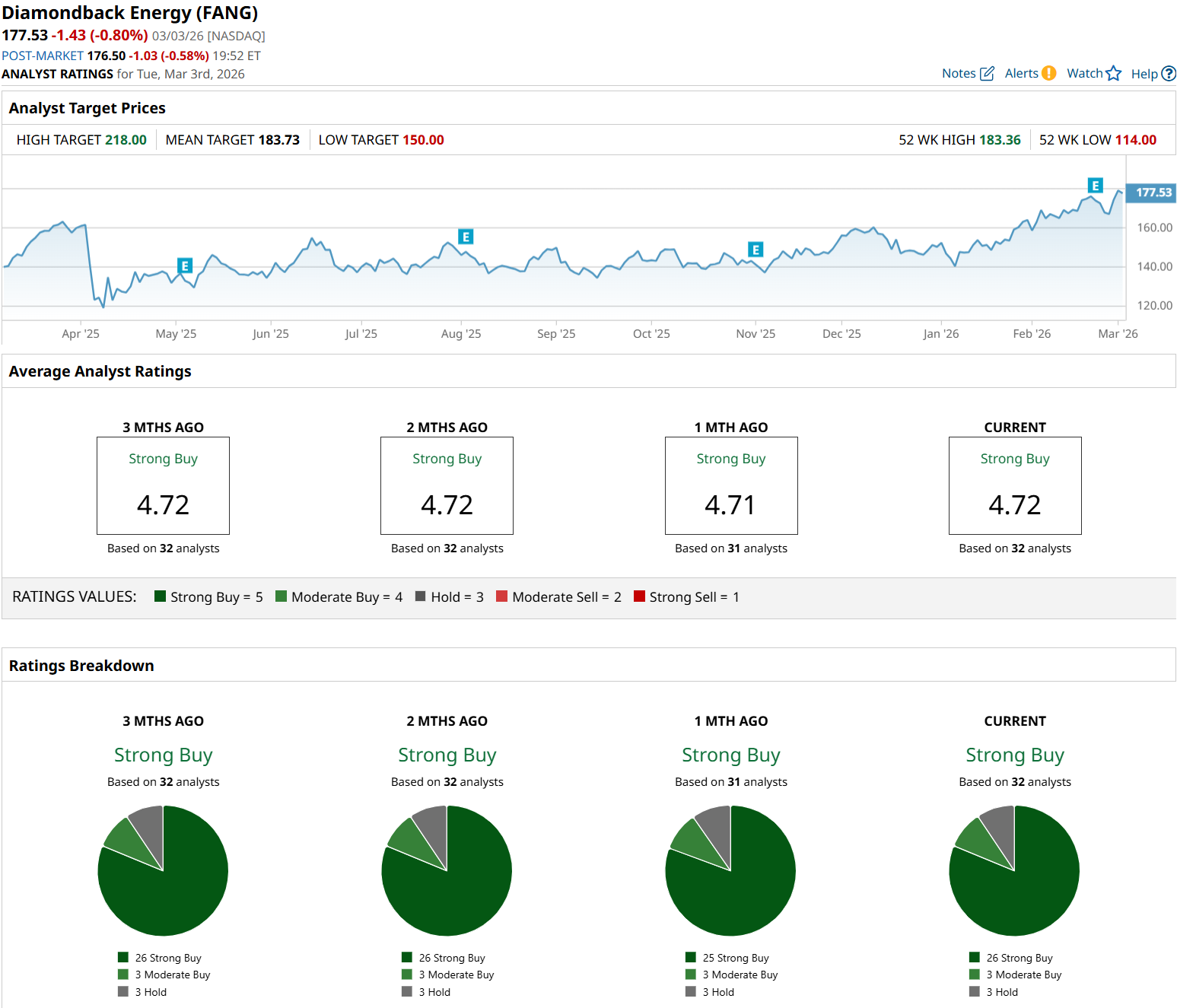 Analysts remain highly positive on FANG stock, with around 32 analysts assigning an overall “Strong Buy” rating and an average target near $184.87, implying roughly 3% potential upside from recent price levels.