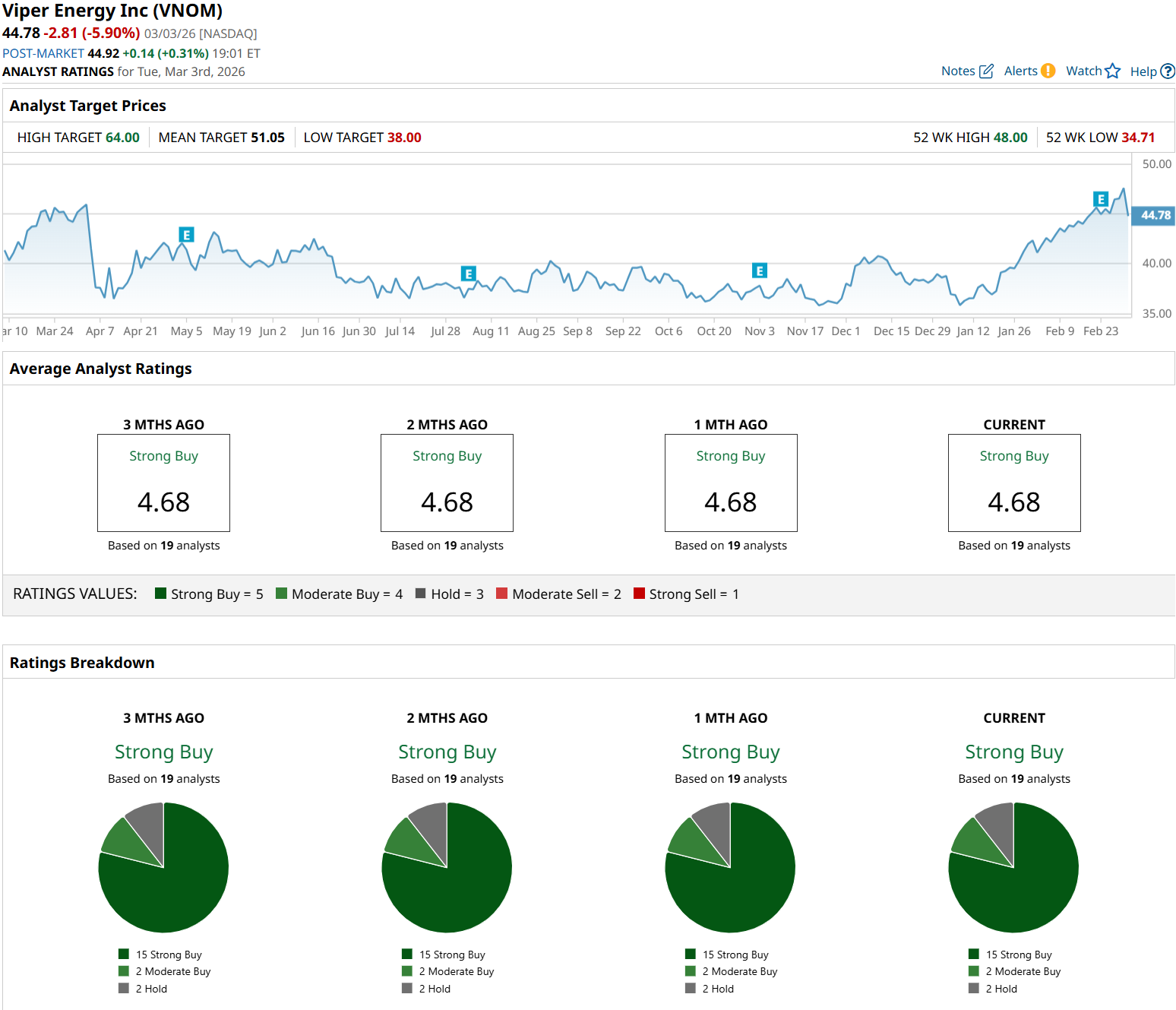 All 19 analysts surveyed assign VNOM stock a consensus “Strong Buy” rating and an average price target of $51.05. That implies roughly 16% potential upside from recent levels.