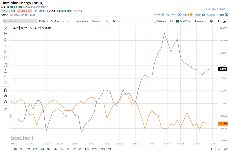 Shares of the Richmond, Virginia-based company have dipped 6.8% from its 52-week high of $67.57. Shares of Dominion Energy have risen 7.7% over the past three months, outperforming the broader Nasdaq Composite's ($NASX) 3.5% decline during the same period.