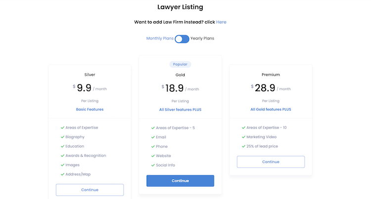 In both cases, the database offers monthly and yearly subscription options. For example, the Gold Lawyer Listing costs $18.9 per month, while the yearly plan comes with the $149 price tag, meaning around $12.4 monthly or about 25% off.