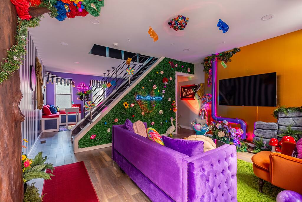 Pictured: interior photo of Meyer’s Willy Wonka-themed Airbnb