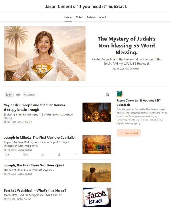 Jason Ciment, co-founder of digital marketing agency Get Visible and author of the Amazon bestseller I Need More Clients, has launched "If You Need It," a weekly Substack newsletter offering fresh Torah commentary timed to the weekly synagogue reading.
