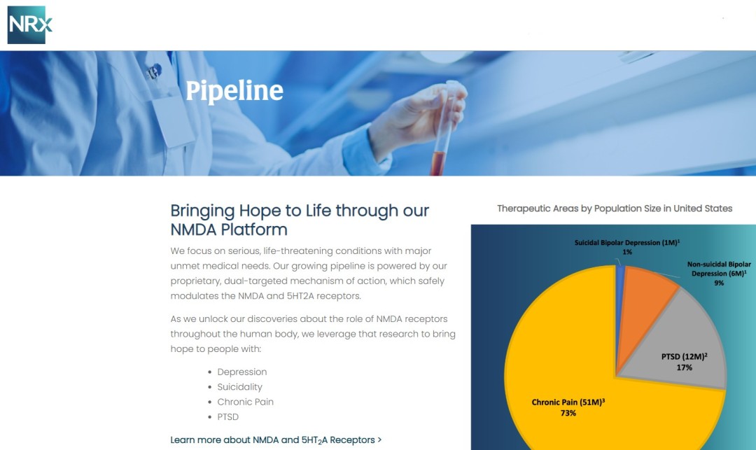 NRx Pharmaceuticals, Inc. (Nasdaq: NRXP) is a clinical-stage biopharmaceutical company developing therapeutics based on its NMDA platform for the treatment of central nervous system disorders, specifically suicidal bipolar depression, chronic pain and PTSD. NRXP is developing NRX-101, an FDA-designated investigational Breakthrough Therapy for suicidal treatment-resistant bipolar depression and chronic pain