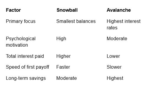 From a purely financial perspective, the avalanche method is the most efficient. Since interest accumulates fastest on high-rate debts like credit cards, paying them off first reduces the total interest you pay across your repayment timeline.