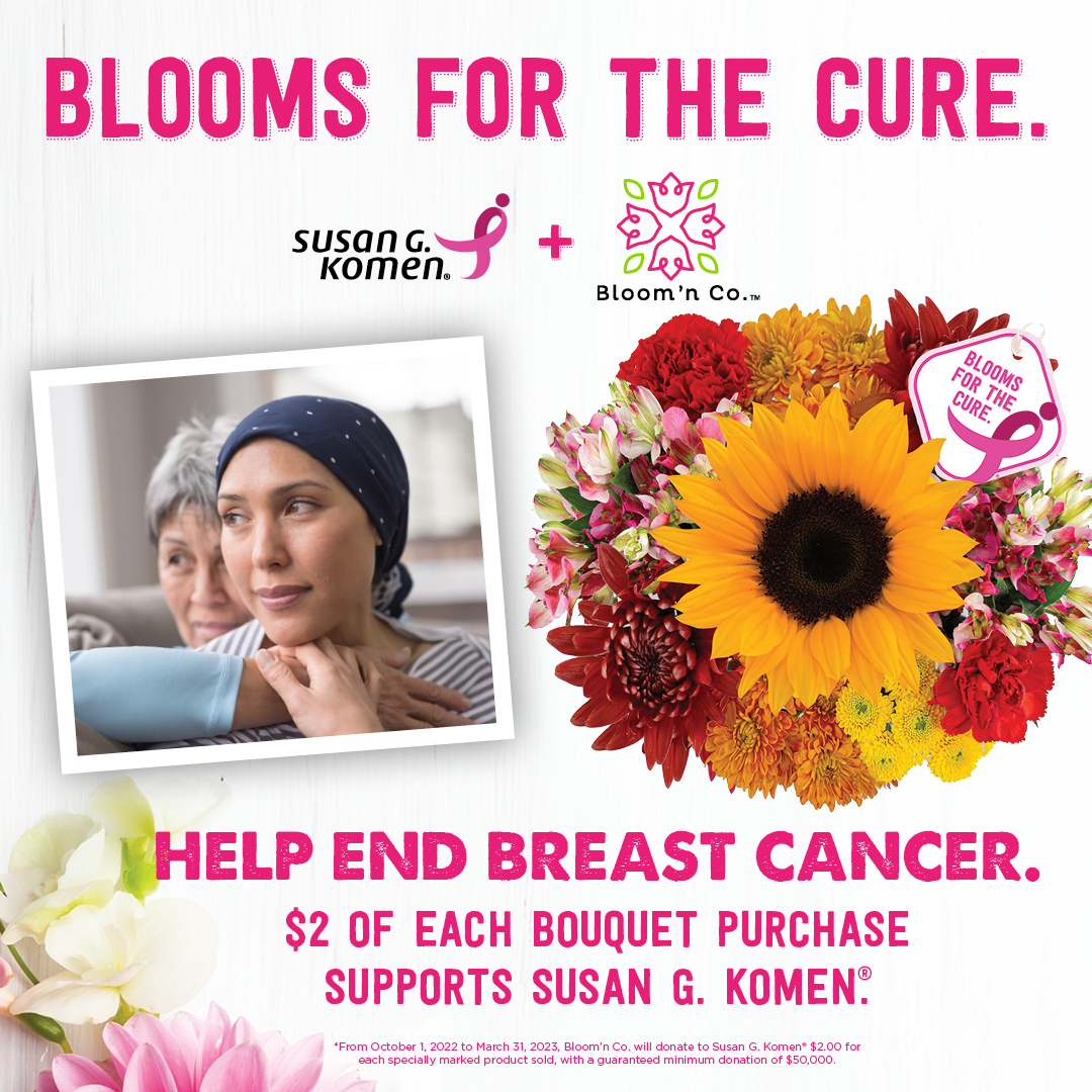 Elk Grove Village, Illinois, Oct. 28, 2022 (GLOBE NEWSWIRE) -- Bloom’n Co., an own brand procured by Topco to support member-owners in their floral space, announced today it has joined the fight to end breast cancer by supporting Susan G. Komen®, the world's leading breast cancer organization. Through its Blooms For The Cure promotion, $2 from every specially marked seasonal bouquet purchased during the month of October will support Komen's efforts to drive breast cancer research and provide critically needed patient support services such as the nation's only breast care helpline, financial assistance, breast cancer patient navigation and screening and diagnostics.