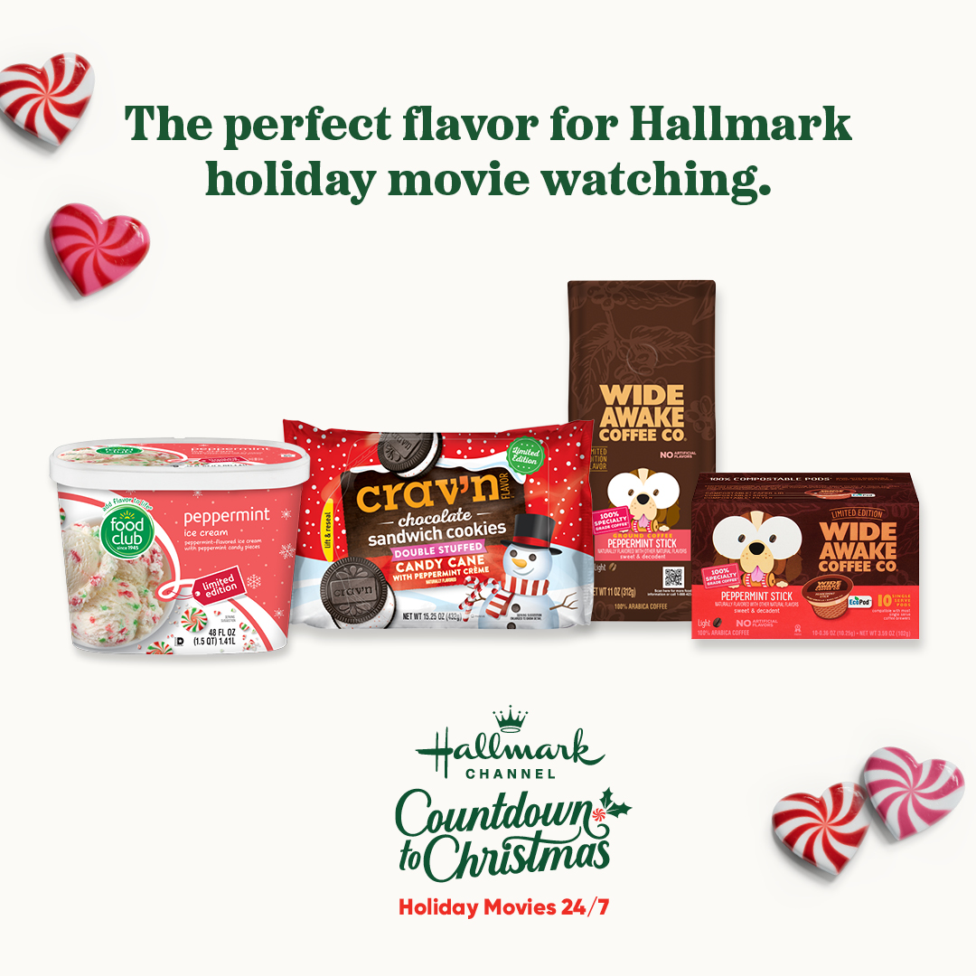 Peppermint-flavored limited time offer items include Crav’n Flavor Candy Cane Sandwich Cookie, Food Club Peppermint Ice Cream and Peppermint Twists, and Wide Awake Coffee Co. Peppermint Stick Coffee, available in ground beans and compostable single-serve pods. The brands will also offer peppermint-themed recipes to inspire shoppers and prepare them for a Hallmark Channel holiday movie-watching marathon.