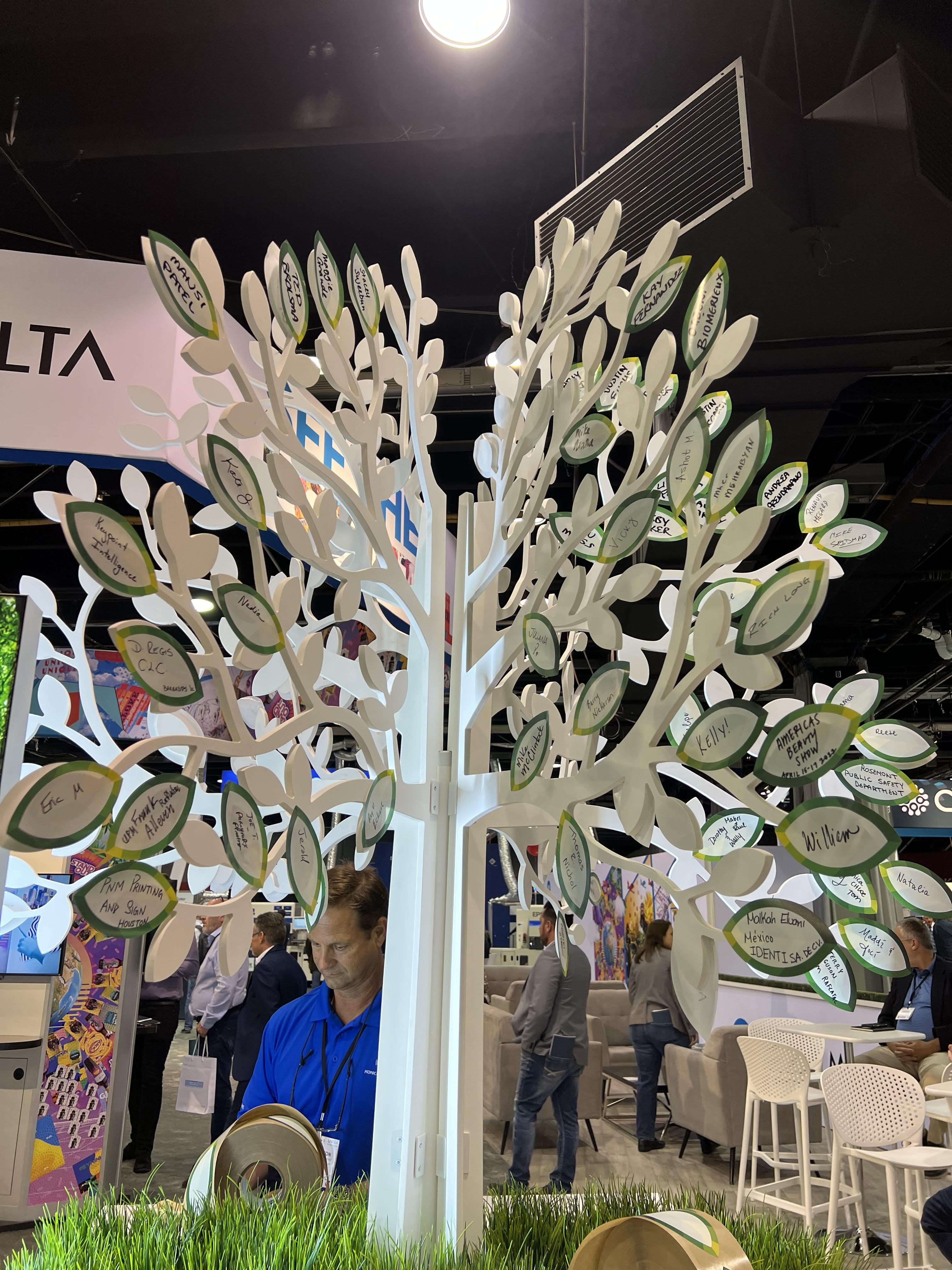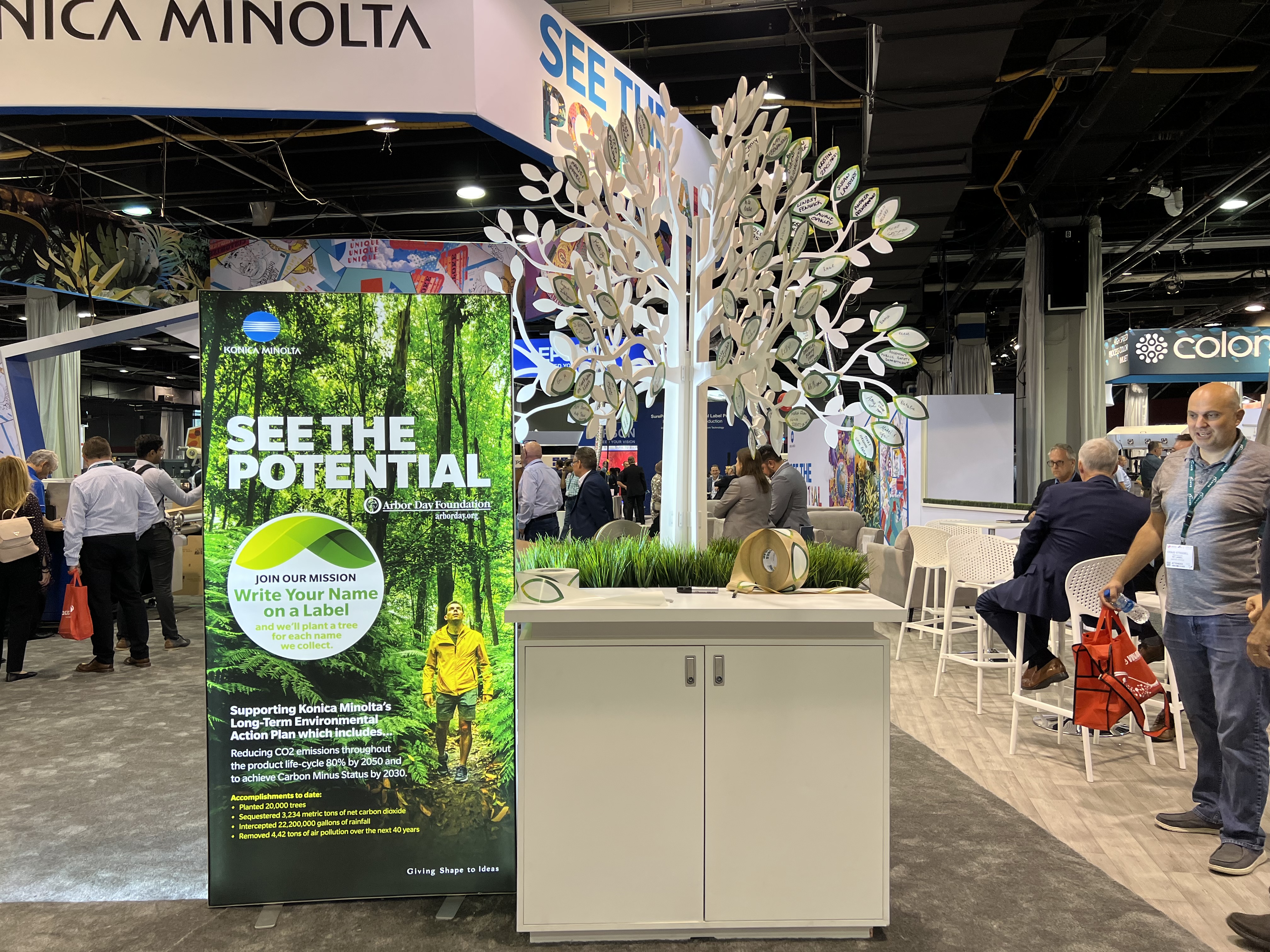 Considering its environmental action plan and partnership with the Arbor Day Foundation, Konica Minolta’s marketing team developed an activation to plant a tree for every booth visitor as a fun way to engage attendees, who could write their name or company on a label and adhere it as a “leaf” to a large white tree behind the booth’s check-in desk. Rolls of specially designed labels were printed on a Konica Minolta label printing press for the activation.