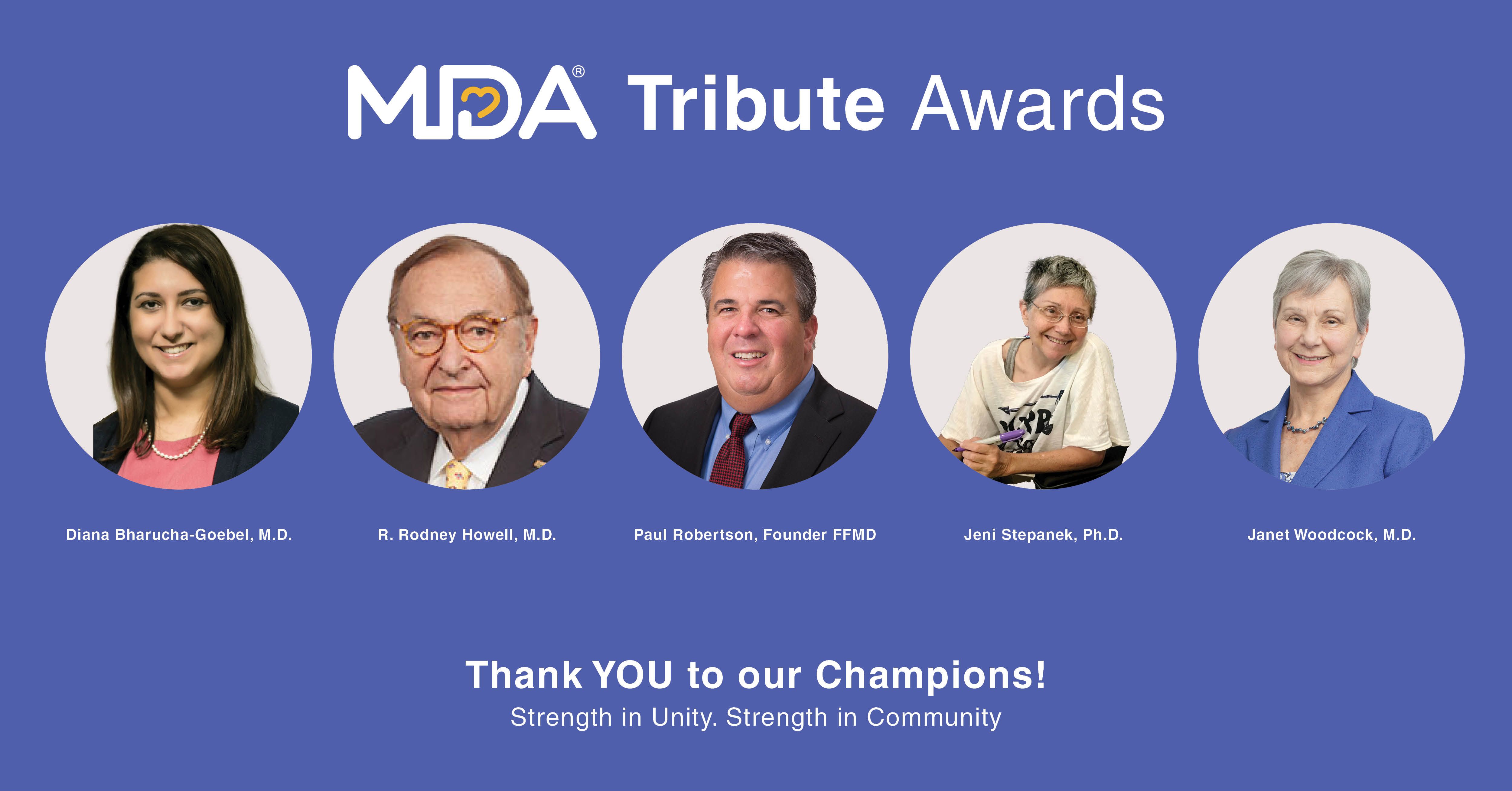 New York, NY, May 11, 2023 (GLOBE NEWSWIRE) -- Muscular Dystrophy Association (MDA) Tribute Awards will be held in Washington D.C. to honor: Diana X. Bharucha-Goebel, M.D., Associate Professor, Pediatrics and Neurology, Children's National Hospital; R. Rodney Howell, M.D., worldwide leader of newborn screening, Professor and Chairman of Pediatrics, Emeritus, Hussman Institute for Human Genomics, University of Miami, Miller School of Medicine, Emeritus Member and former Chairman of the Board of Directors of MDA; Paul Robertson, Founder of Fishing For Muscular Dystrophy; Jeni Stepanek, Ph.D., aka Mama Peace, MDA family member and award-winning speaker and writer, as well as a noted advocate for personal and world peace and children's and families' needs and rights in health and education; and Janet Woodcock, M.D., Principal Deputy Commissioner, Food and Drug Administration, an advocate for American patients and consumers, working to help the Commissioner develop and implement key public health initiatives. The MDA Tribute Award recipients have all contributed to significant progress in accelerating research, advancing care, and advocating for the support of people living with neuromuscular diseases. The MDA Tribute Awards presentation and reception will be held on Saturday, June 3, 2023, from 6-8:30pm at The National Press Club.