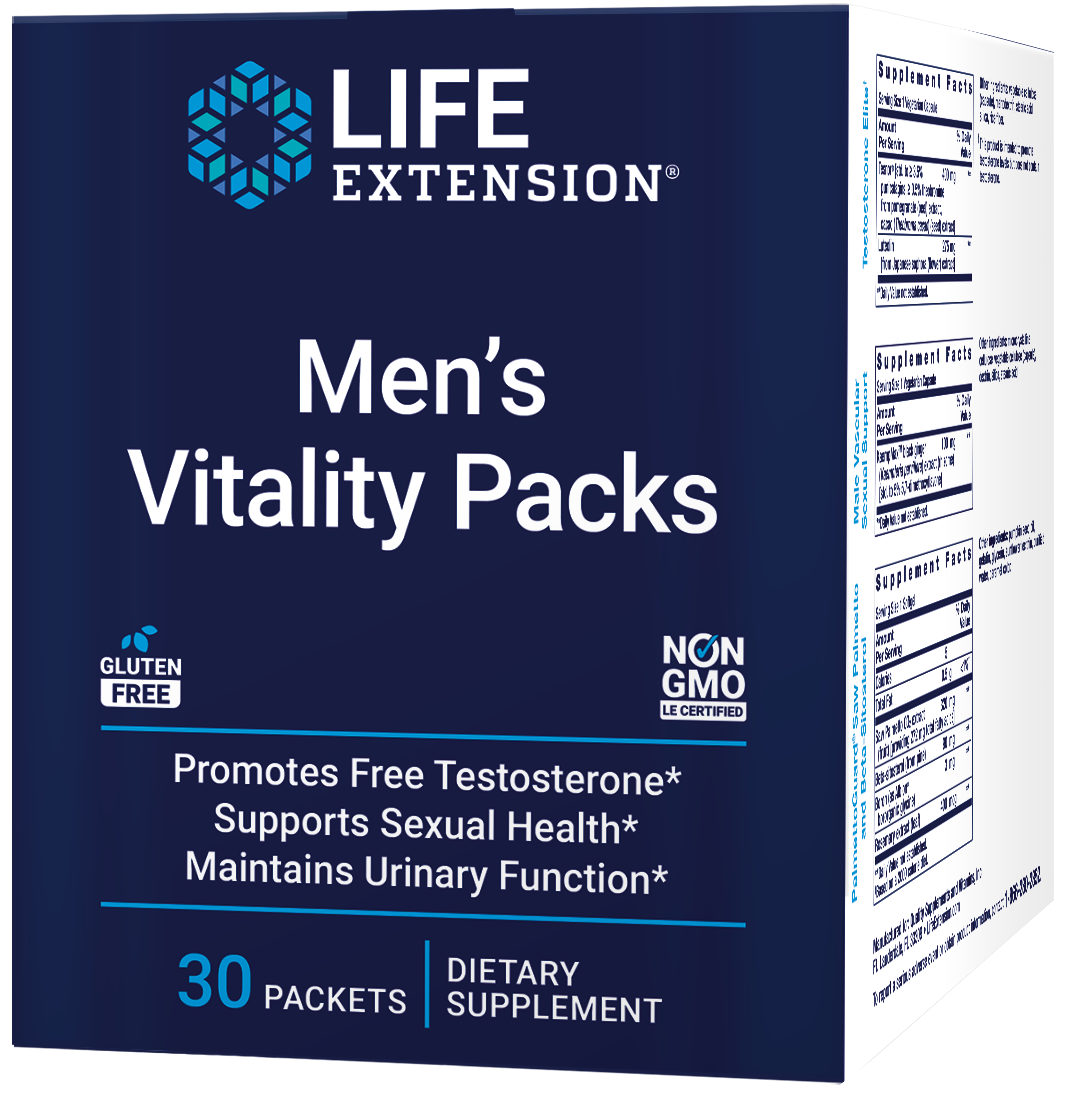 Men’s Vitality Packs was developed to offer comprehensive support for the health topics that impact men the most. “We saw an opportunity to provide tailor-made support for men,” explained Glenn MacEachern, Vice President Product Development at Life Extension. “Men’s Vitality Packs combine three of our science-based men’s health formulas into one convenient daily pack. This health trifecta helps supports men’s sexual health, healthy testosterone production, and optimal prostate and urinary function.”