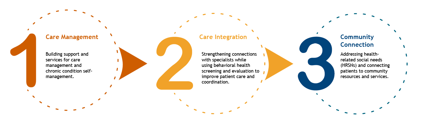 - Community Connection: addressing health-related social needs (HRSNs) and connecting patients to community resources and services.