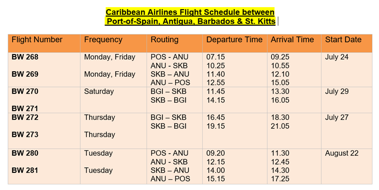 From July 24, the flights will operate a total of five (5) times weekly on Monday, Tuesday, Thursday, Friday, and Saturday providing convenient travel options between Port of Spain (POS), Barbados, Antigua, and St. Kitts. (See table with flight schedule).