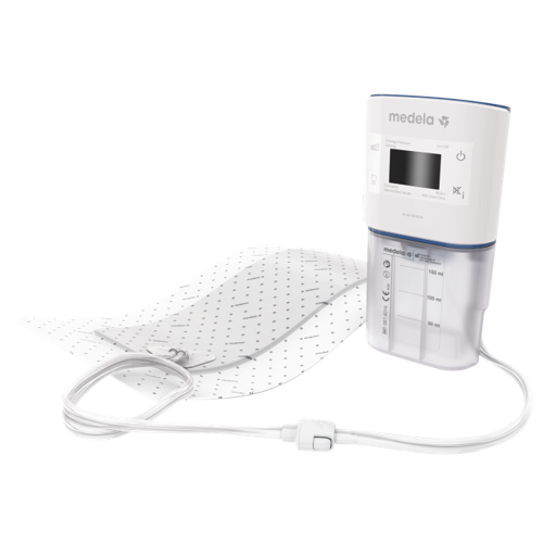 The Medela system also includes Dynamic Exudate Removal technology featuring double-lumen tubing to prevent blockages, efficiently remove exudate, and dynamically adapt to fluid fluctuations to pull fluid away from the wound and into the canister while allowing the body to continue its natural wound healing and tissue regeneration process.