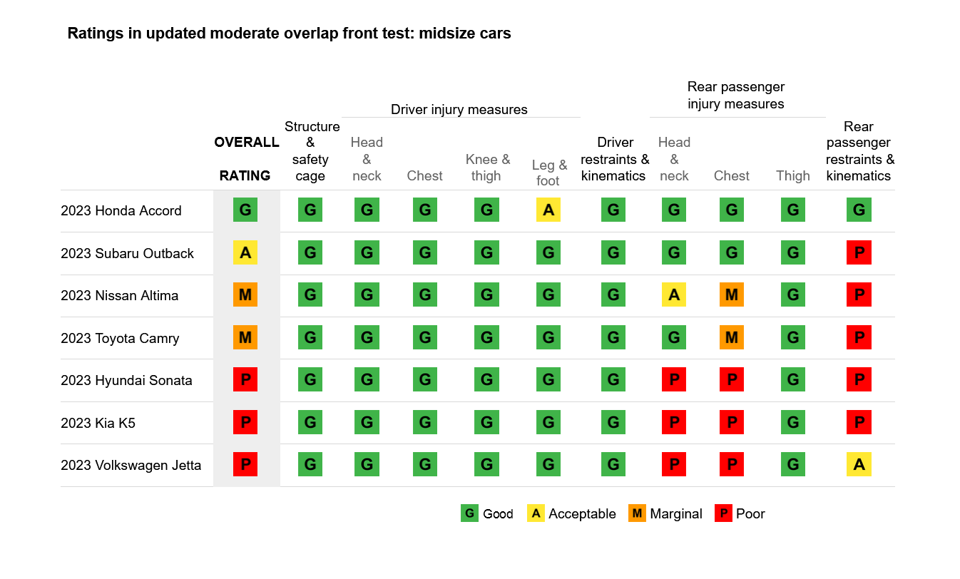 Among the other six midsize cars tested, the Subaru Outback earns an acceptable rating. The Nissan Altima and Toyota Camry are rated marginal. The Hyundai Sonata, Kia K5 and Volkswagen Jetta are rated poor.