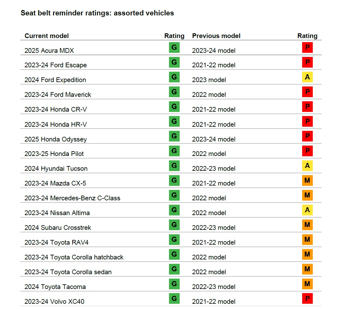 Eighteen vehicles with seat belt reminders that previously fell short recently earned good ratings from IIHS for their latest models. The improved vehicles are the Acura MDX, Ford Escape, Ford Expedition, Ford Maverick, Honda CR-V, Honda HR-V, Honda Odyssey, Honda Pilot, Hyundai Tucson, Mazda CX-5, Mercedes-Benz C-Class, Nissan Altima, Subaru Crosstrek, Toyota Corolla hatchback, Toyota Corolla sedan, Toyota RAV4, Toyota Tacoma and Volvo XC40.