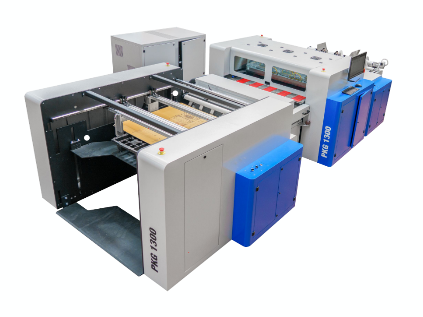 Konica Minolta’s PKG-1300 digital full color packaging printer is designed for corrugated manufacturers, converters, printers and brand owners looking for an automatic industrial digital print solution. The press is available in three configurations, from basic manual feeding to fully automated feeding and stacking, all inline. Media types for the printer include paper-based materials of uncoated corrugated and uncoated folding carton stock with a maximum width up to 51.18”. Maximum imaging width is up to 42.52”. The media thickness ranges from 0.039” (0.9906mm) to 1.96” (49.987mm). There are five HP Thermo printheads running across the imaging area with adjustable stitching.