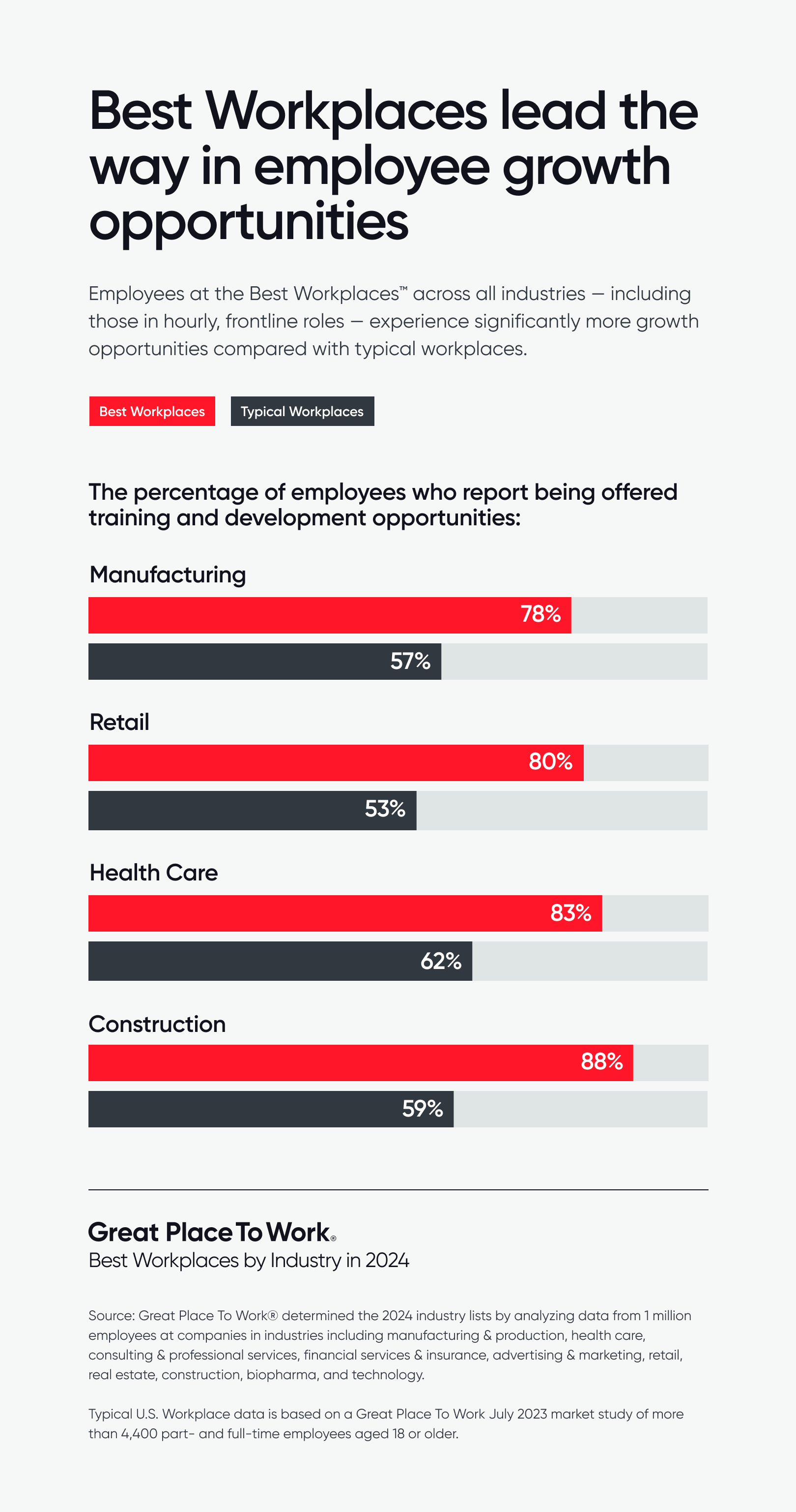 For example, the Fortune Best Workplaces in Construction™ offer more opportunities for career growth than typical workplaces in any industry. Nearly 90% of employees feel they have professional development opportunities – among the highest at the Best Workplaces in any industry.
