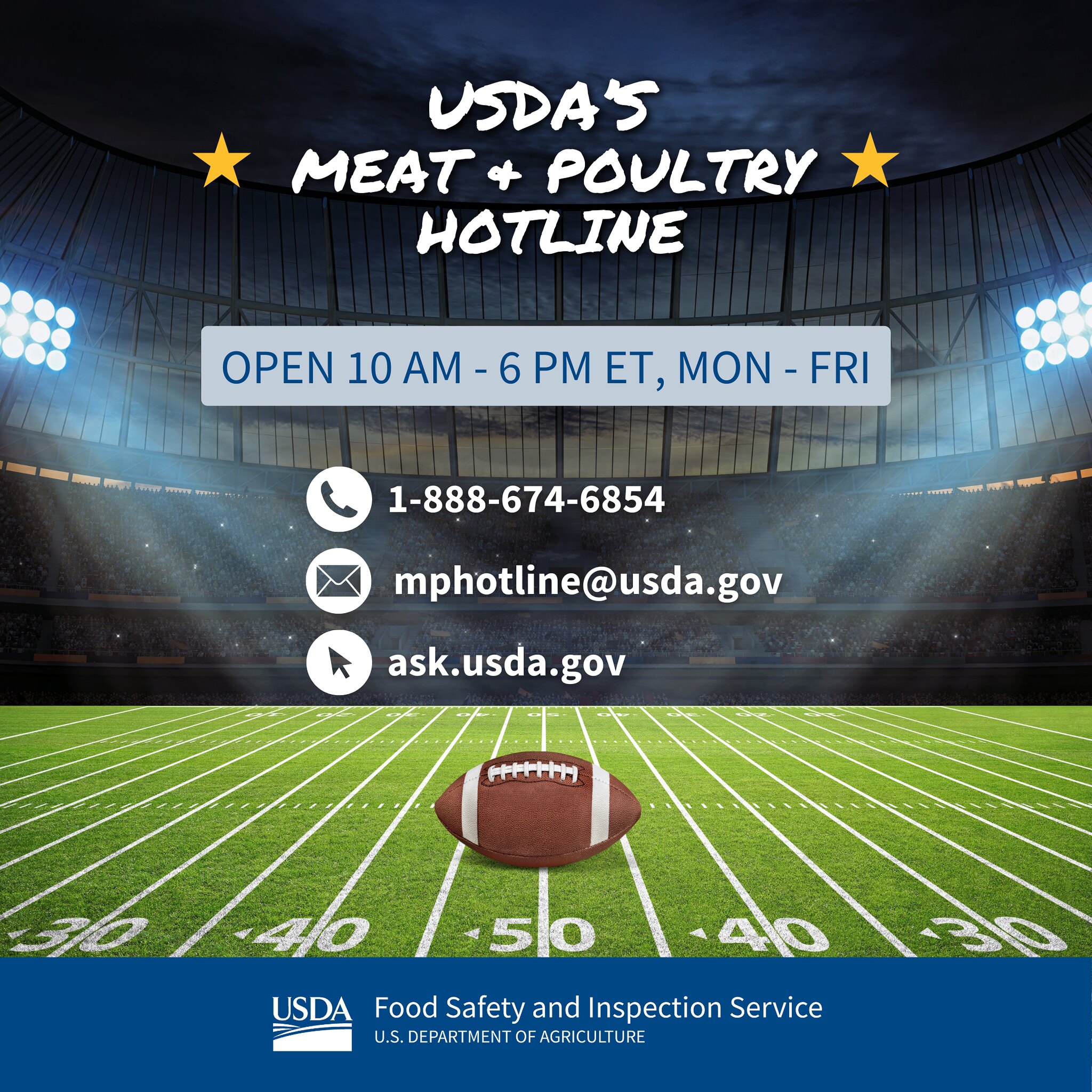 If you have food safety questions, call the USDA Meat and Poultry Hotline at 1-888-MPHotline (1-888-674-6854), email MPHotline@usda.gov or chat live at ask.usda.gov 10 a.m. to 6 p.m. Eastern Time, Monday through Friday.
