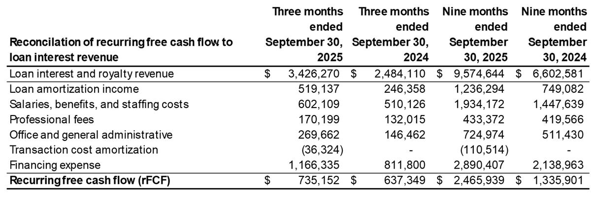 Recurring Free Cash Flow is an internally defined, non-IFRS measure calculated as loan interest and royalty income less loan amortization income, one-time payments, salaries, professional fees, office and general administrative expenses, and financing expenses.