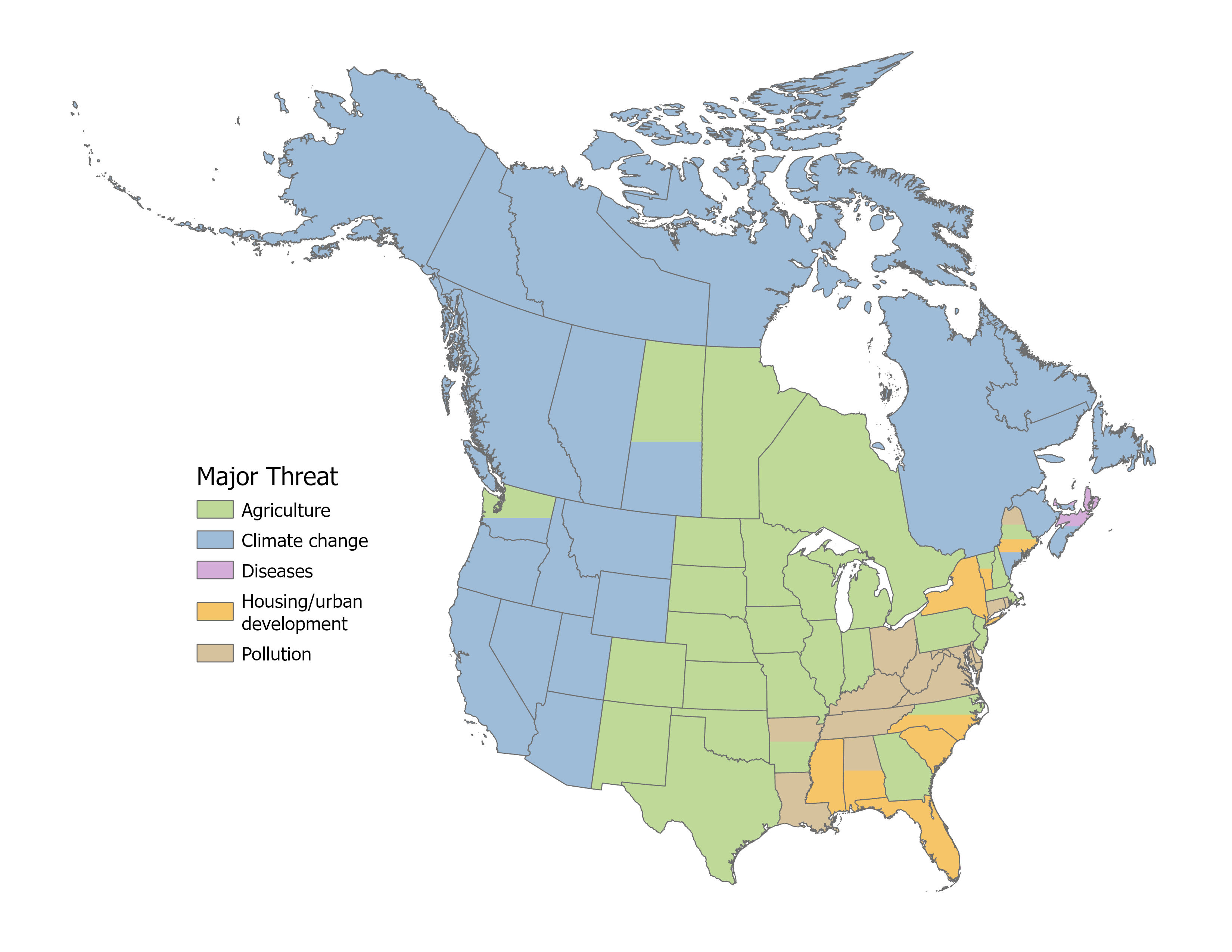 - Primary Threats: Climate change, agriculture, habitat loss, and urban development are the leading threats, varying regionally across North America.