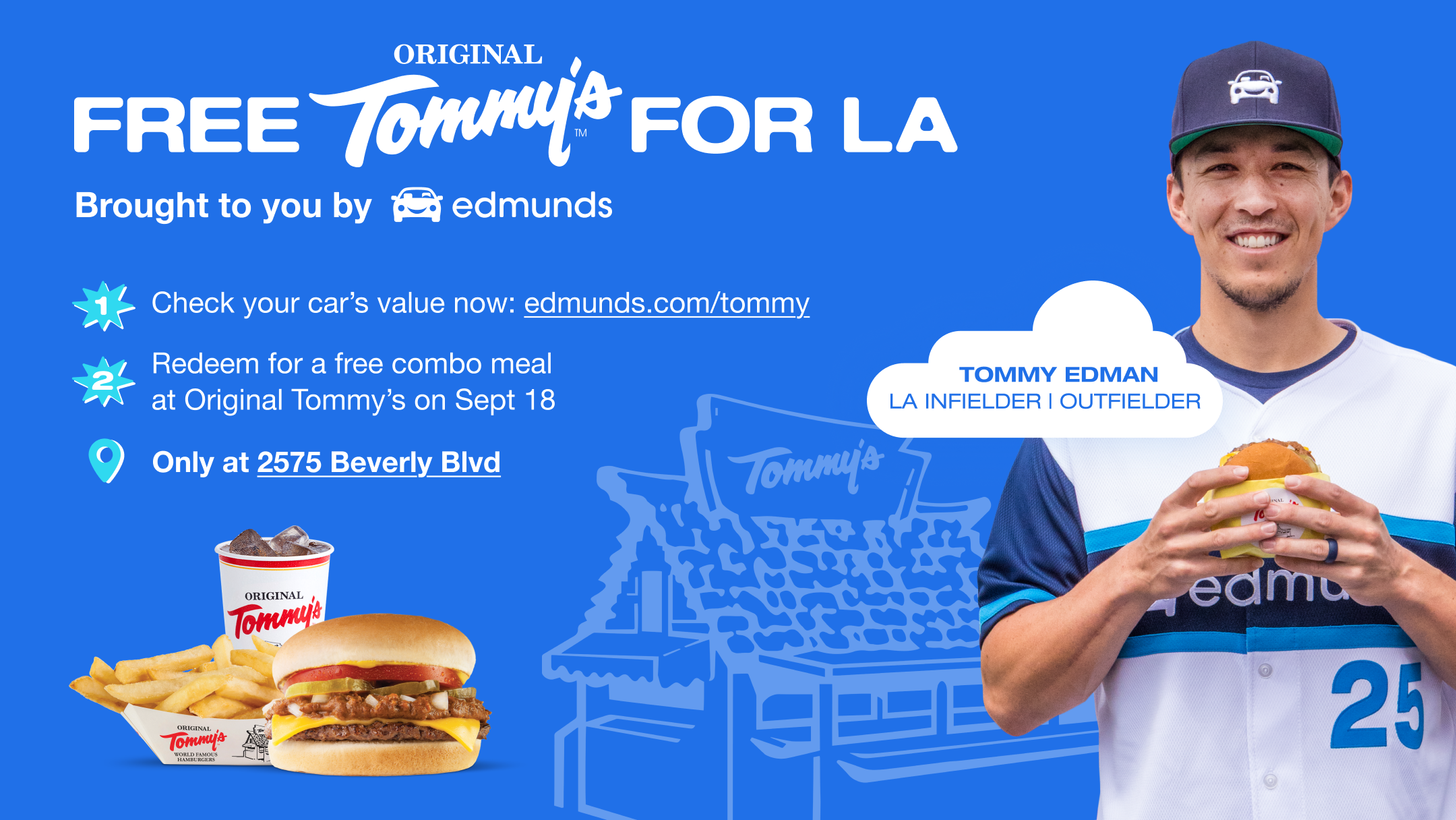“Partnering with the legendary LA burger spot Original Tommy’s alongside my preferred car shopping site Edmunds for a massive burger giveaway is the perfect opportunity to say thank you to fans for helping make my transition to LA so memorable over the past year-plus,” said pro LA baseball player Tommy Edman. “The passion and pride in hard work and championship-caliber baseball can be felt everywhere in this city. A free chili cheeseburger combo meal is the fuel we all need to end the season strong.”