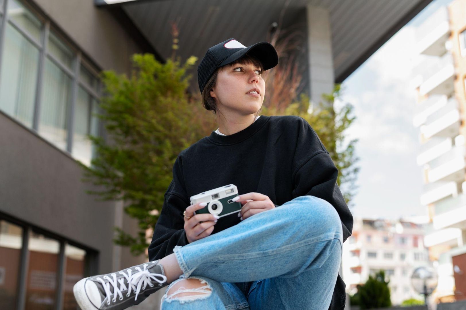A cap paired with a T shirt, jeans, and sneakers creates a relaxed and comfortable outfit. This is one of the most common ways to wear caps.