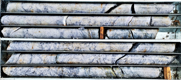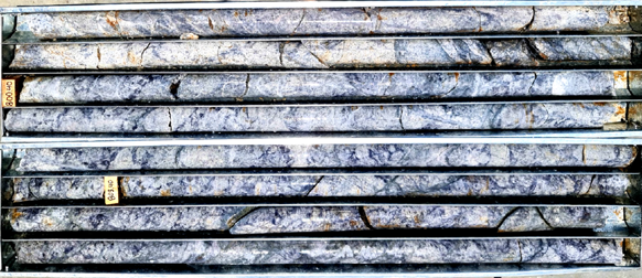 Figure 2. Drillhole CDH003 core (295.18 – 300.60m): Mineralized quartz diorite porphyry with dominant bornite and lesser chalcopyrite
