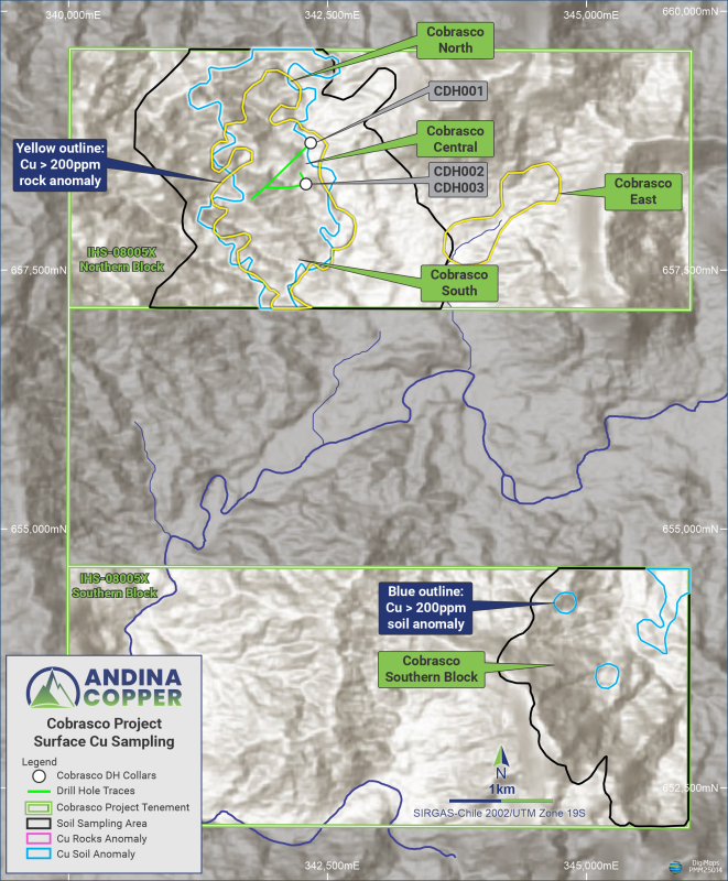 Upon completing follow up work at Cobrasco East, the Andina Copper exploration team will continue reconnaissance mapping and rock chip sampling at Cobrasco North, Cobrasco South and the Southern Block, as well as exploring the broader regional potential.